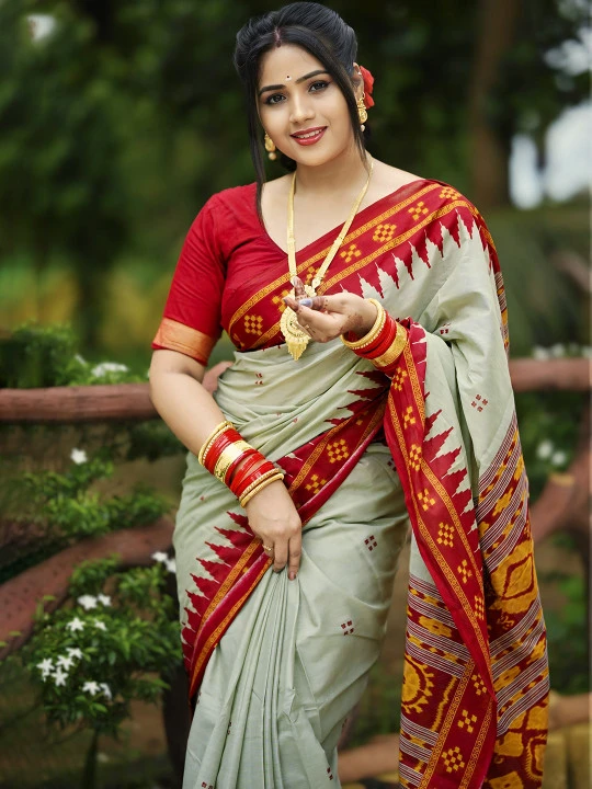 The model is wearing a blouse from our stylist's collection, the saree does not come with a blouse piece