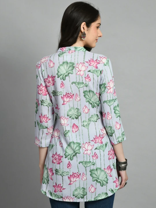 Blue and pink printed tunic ,has a mandarin collar, three-quarter sleeves, button closure