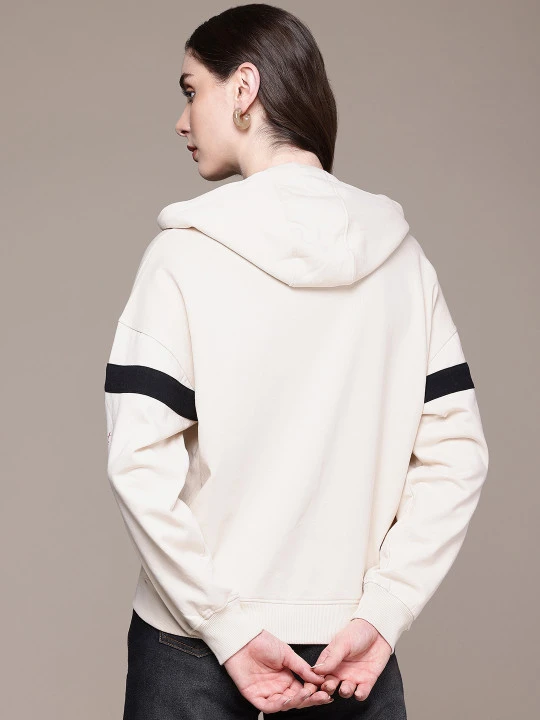 Cream-coloured printed sweatshirt has a hooded, 2 kangaroo pockets, long sleeves, zip closure, ribbed hem
