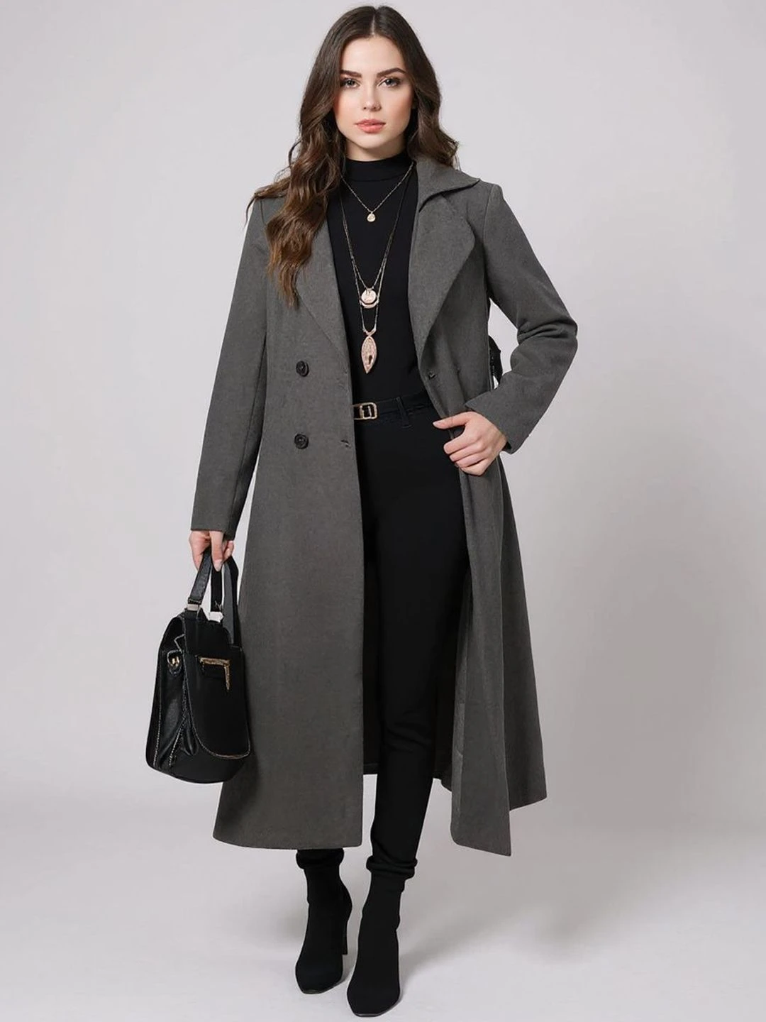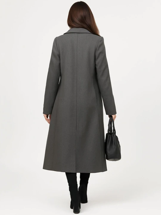 Grey solid single-breasted overcoat, has double collar, long sleeves, button closure, a straight hem